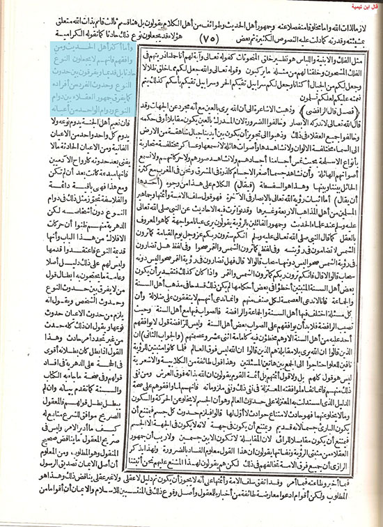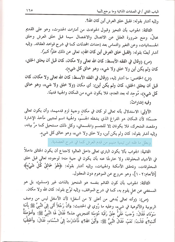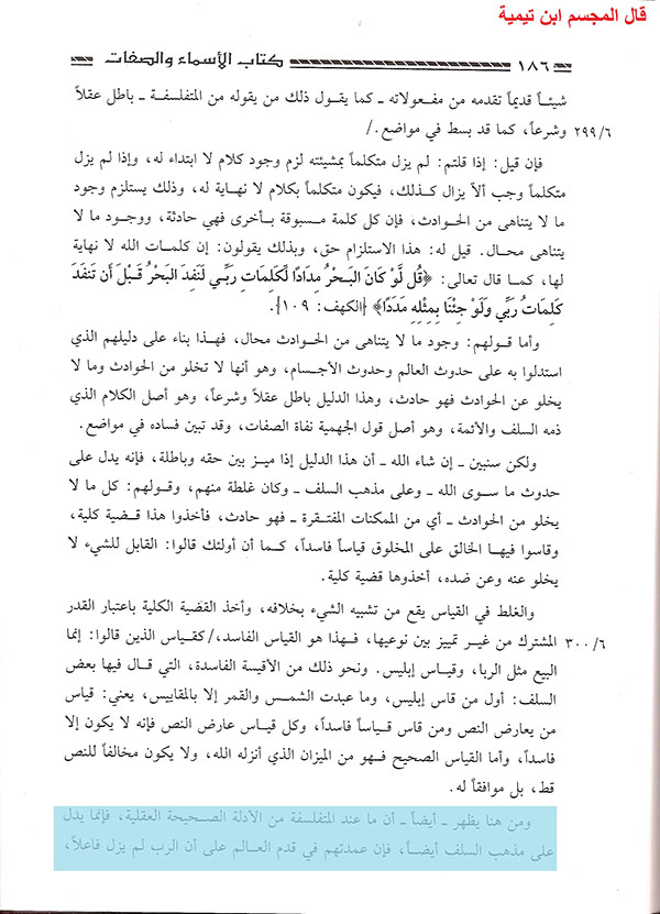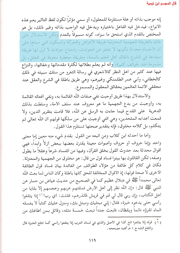 وقال فيه ما نصه (ولكن الاستدلال على ذلك بالطريقة الجهمية المعتزلية طريقة الأعراض والحركة والسكون التي مبناها على أن الأجسام محدثة لكونها لا تخلو عن الحوادث، وامتناع حوادث لا أول لها طريقة مبتدَعة في الشرع باتفاق أهل العلم بالسنة، وطريقة مخطرة مخوفة في العقل بل مذمومة عند طوائف كثيرة) ا.هـ
