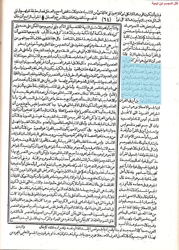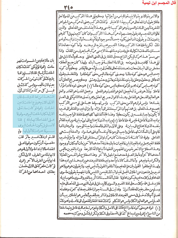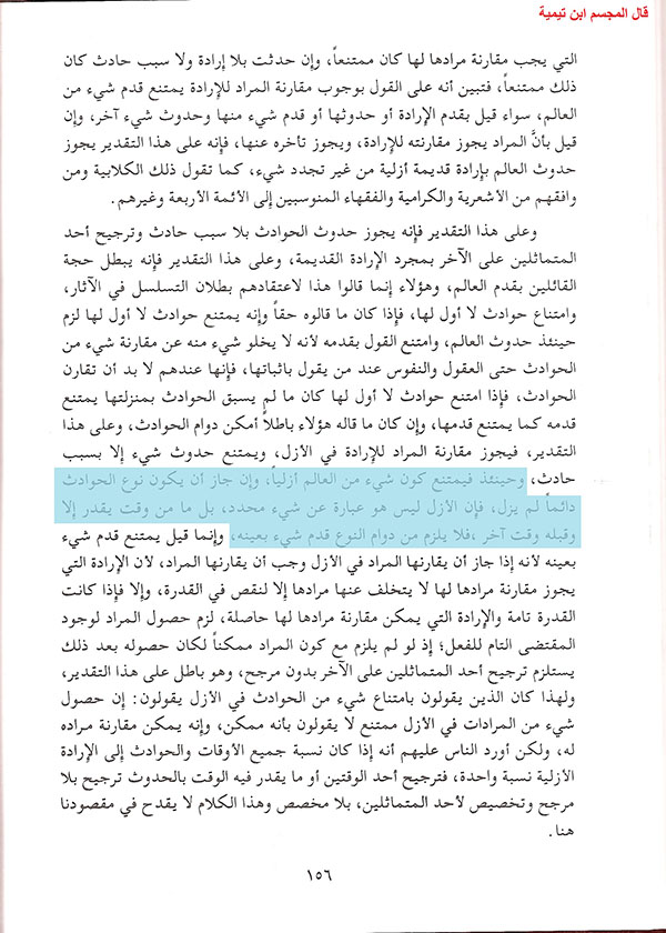 ويقول فيها أيضا ما نصه ”فمن أين في القرءان ما يدل دلالة ظاهرة على أن كل متحرك محدث أو ممكن، وأن الحركة لا تقوم إلا بحادث أو ممكن، وأن ما قامت به الحوادث لم يخل منها، وأن ما لا يخلو من الحوادث فهو حادث، وأين في القرءان امتناع حوادث لا أول لها" ا.هـ. فهذا من عجائب ابن تيمية الدالّة على سخافة عقله قوله بقدم العالم القدم النوعي معحدوث كل فرد معين من أفراد العالم