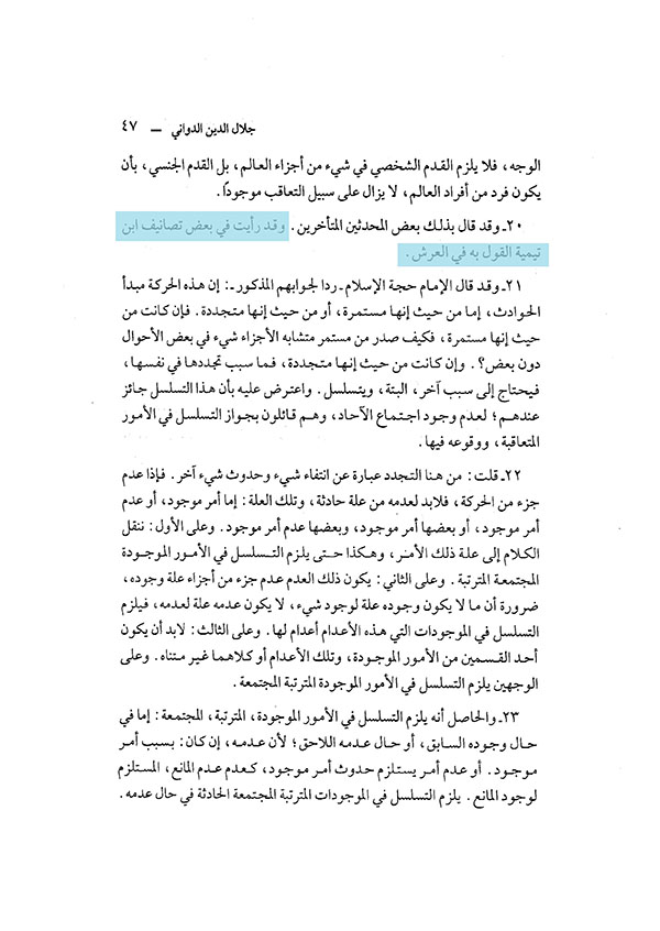 وقال في موضع ءاخر في ردّ قاعدة ما لا يخلو من الحادث حادث لأنه لو لم يكن كذلك لكان الحادث أزليًا بعدما نقل عن الأبهري أنه قال: قلنا لا نسلم وانما يلزم ذلك لو كان شىء منالحركات بعينها لازمًا للجسم، وليس كذلك بل قبل كل حركة حركة لا إلى أول، ما نصه : "قلت هذا من نمط الذي قبله فإن الأزلي اللازم هو نوع الحادث لا عين الحادث، قوله لو كانت حادثة في الأزل لكان الحادث اليومي موقوفا على انقضاء ما لا نهاية له، قلنا: لا نسلم بل يكون الحادث اليومي مسبوقًا بحوادث لا أول لها". ا.هـ