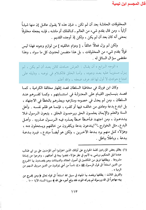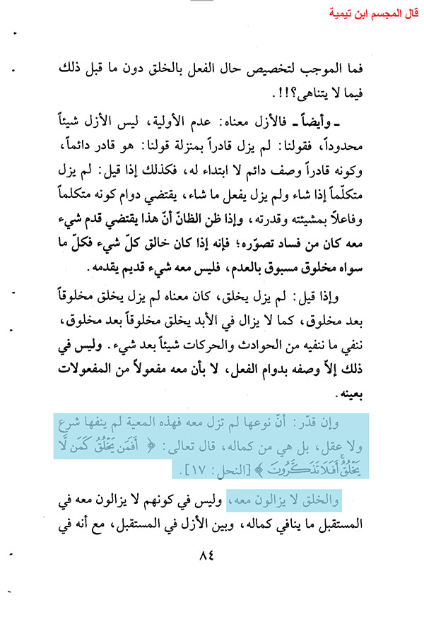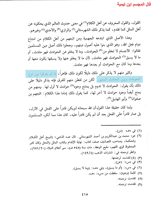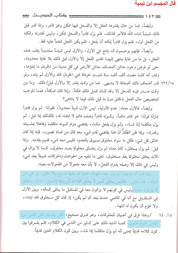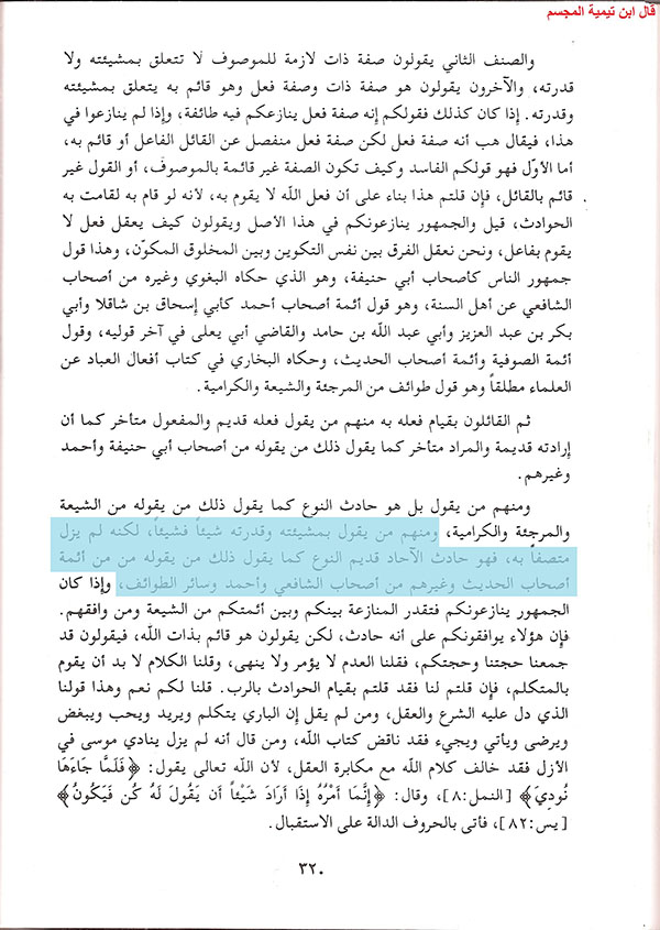 وقال -أي ابن تيمية– في منهاج السنّة النبوية ما نصه "فإن قلتم لنا: فقد قلتم بقيام الحوادث بالربّ، قلنا لكـم: نعم، وهذا قولنا الذي دلّ عليه الشرع والعقل".