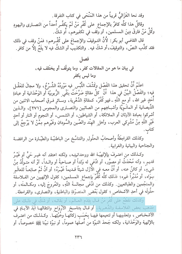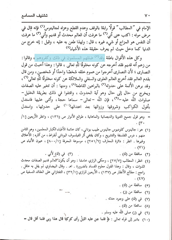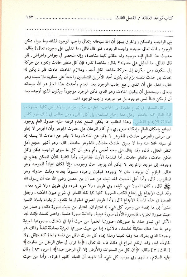 وقال في موضعءاخر منه ما نصه "وقال السبكي في شرح عقيدة ابن الحاجب: اعلم أن حكم الجواهر والأعراض كلها الحدوث، فإذًا العالم كله حادث، وعلى هذا إجماع المسلمين بل وكل الملل، ومن خالف في ذلك فهو كافر لمخالفة الإجماع القطعي" ا.هـ